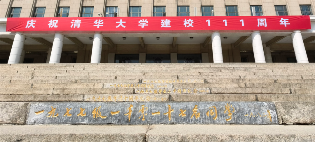 20年前,在77级毕业20周年的2002年的校庆日,大家又相约母校,一致商定,此后每隔10年,都将“一九七七级”的字样刻向主楼的上一级台阶,表示我们初心永在,表达我们对母校的热爱和对同窗的深情。这一庄严的决定,用“1977级世纪宣言”固化下来,“宣言”收录于77级毕业30周年的纪念文集中。这就是现在人们可以看到的,从主楼第二组台阶的最下端算起,有四层台阶,用相同的字体分别刻着“一九七七级毕业十周年、二十周年、三十周年、四十周年纪念”之来由。随着改革开放的不断深入,现代化建设的蓬勃发展,我们迎来了中国特色社会主义新时代,学校的办学理念更加明确,软硬件环境明显改观,校园生活更加丰富多彩。年轻的清华学子迎来了施展才华的难得机遇,希望同学们把个人的奋斗目标和国家需求紧密地联系起来,不负青春韶华,努力成长为肩负并实现民族复兴重任的时代新人。