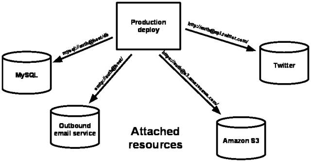 还要指出的是,端口绑定这种方式也意味着一个应用可以成为另外一个应用的 后端服务 ,调用方将服务方提供的相应 URL 当作资源存入 配置 以备将来调用。