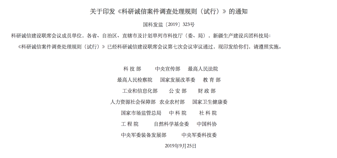 2019年,科技部等20个部门联合发布《科研诚信案件调查处理规则(试行)》,明确规定“买卖、代写论文或项目申请书”被列入科研失信行为。