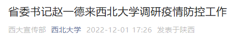 可以肯定的是,目前校园疫情防控仍是重中之重,就在不久前,11月30日上午,省委书记赵一德还曾来到西北大学,调研高校疫情防控工作。赵一德强调,高校始终是疫情防控的重点,全省教育系统和各高校要坚决扛起疫情防控主体责任,切实增强“时时放心不下”的责任感,健全完善校地协同机制和各项应急预案,进一步提高疫情监测、预警和应对能力,严格隔离点规范管理,备足备齐防疫资源力量,做到平战转换迅速、应急处置及时、风险管控有力。