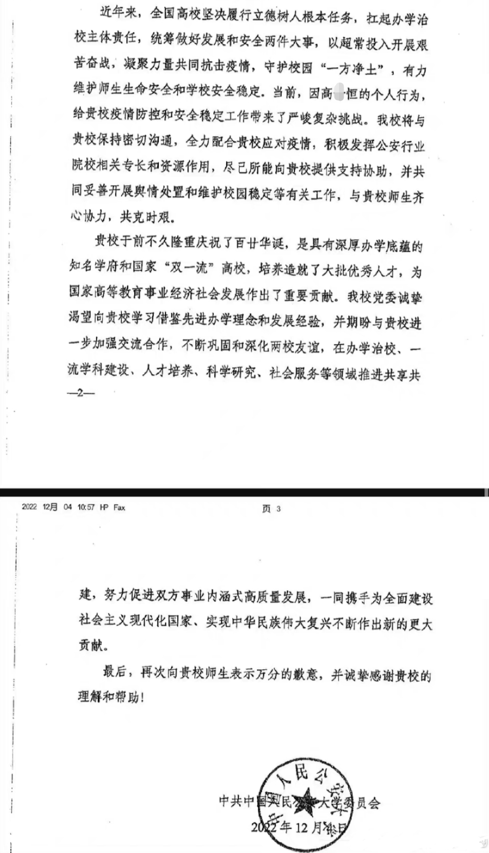 12月4日,中国人民公安大学对此事作出回应,该校委员会发布《关于对贵校通报有关事件的复函》显示:贵校关于我校学生高某恒违反防疫规定造成重大疫情传播风险的通报已收悉。我校党委于12月3日清晨已获悉此事,并迅速责成相关部门认真开展了调查核实工作。在此,首先就高某恒的行为给贵校师生教学生活秩序产生的严重影响和对相关工作造成的损失深表歉意!学校党委对此事件高度重视,第一时间召开专题会议,听取相关事件经过,研究有关处置意见。高某恒擅自翻墙进入贵校校园并违规留宿的行为,严重违反我校关于学生离校返乡的有关纪律要求,严重违反贵校疫情防控和校园管理相关规定,与其作为公安院校学生的身份严重不符,造成极为恶劣的影响,既给贵校师生带来健康安全风险和一系列负面影响,也严重损害了我校作为公安院校的形象和社会声誉。学校党委坚决严肃追究责任,现已按照学校关于学生违纪处分的有关规定,拟对高某恒作开除学籍处理,决不包庇姑息,目前正在履行相关程序,我校将及时告知贵校处理结果。同时,将以此事件作为反面案例在全校范围予以通报,进一步加强对全校学生的警示教育和全面从严管理,教育学生深刻汲取惨痛教训,切实引以为鉴,树牢正确是非观念,强化法纪和规矩意识,严格自我教育、自我管理,把稳人生之舵,夯实为人处世,从警成才的思想根基。但另外一部分人认为,这名学生违反返乡纪律条例,翻墙进校,违规留宿,最关键还卡上一个公安系统院校,应当严肃处理。