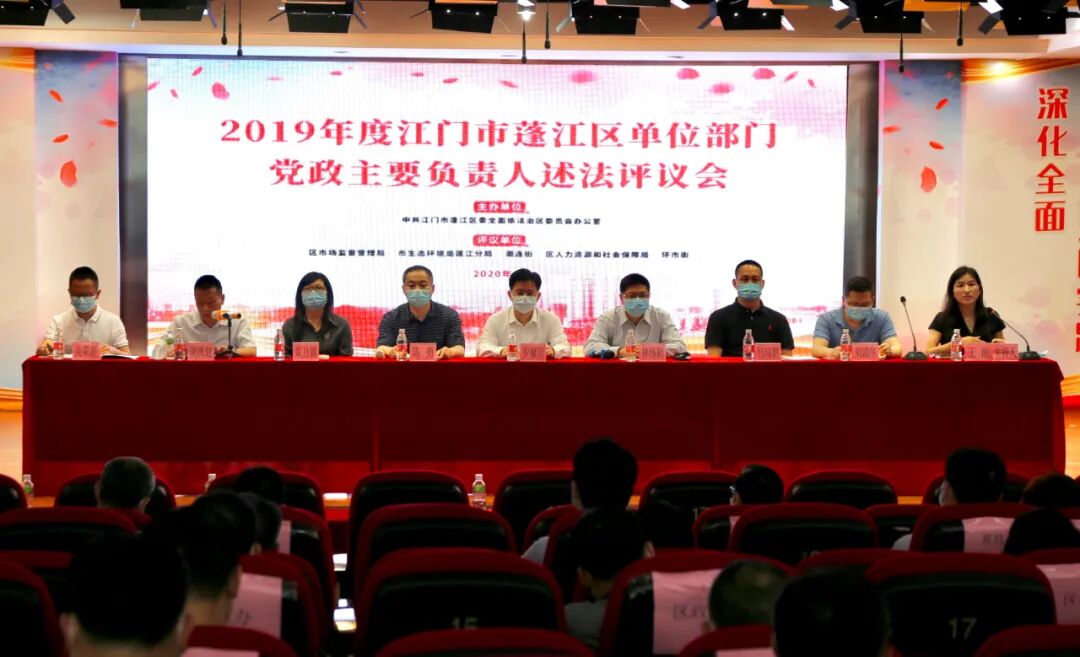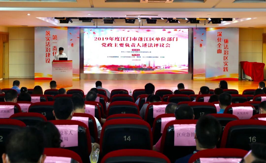4月21日,蓬江区举行单位部门党政主要负责人述法评议活动。省委依法治省办相关负责人,市、区司法局相关负责人、区直有关部门单位责任人约80人出席。