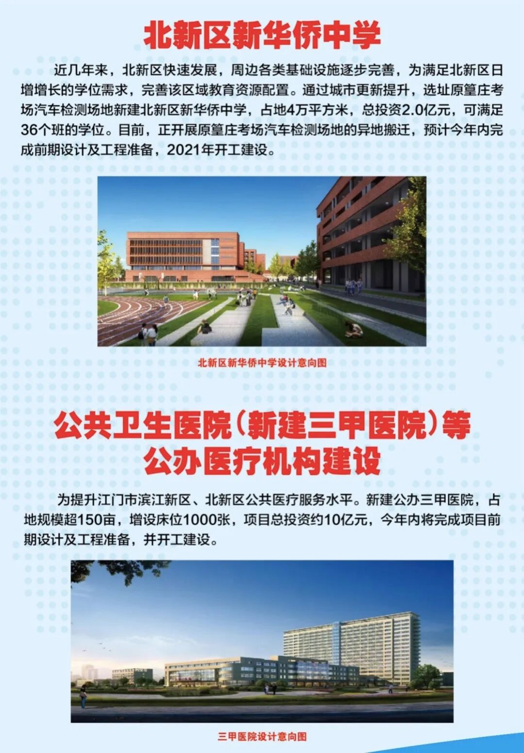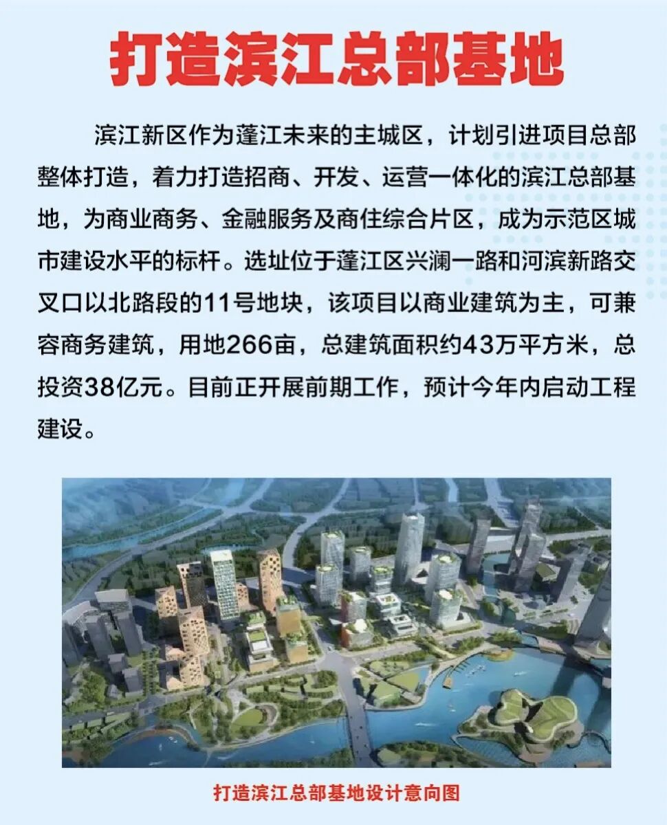 滨江新区,抓好滨江总部基地的整体规划调整,加快与中铁建合作建设湾区总部,推动总部经济区建设。加快推动滨江新区启动区二期“十路一湖”项目、市档案中心、广东实验中学附属江门学校、银葵医院等公共服务配套设施建设。