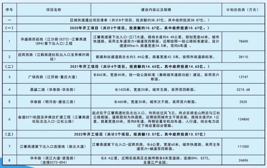 重点推动江门大道-佛开高速连接线、江肇高速棠下和杜阮出入口连接线、华盛路西延线、迎宾西延长线等10项交通项目建设,计划总投资约129.27亿元,打通产城融合“主动脉”,推动中心城区与周边市、区实现一体化串联。