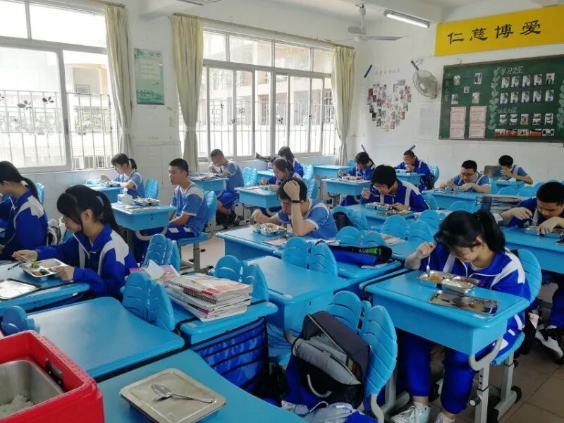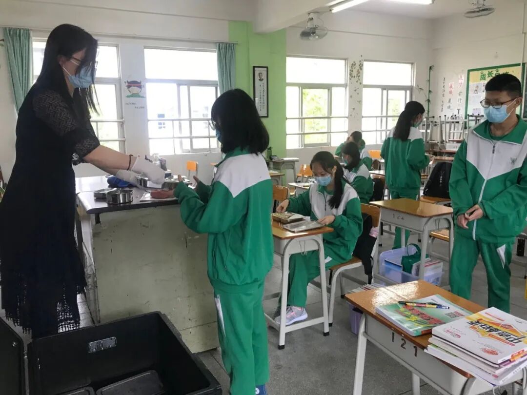 图为培英初中学生在教室组织下有序领餐吃饭。