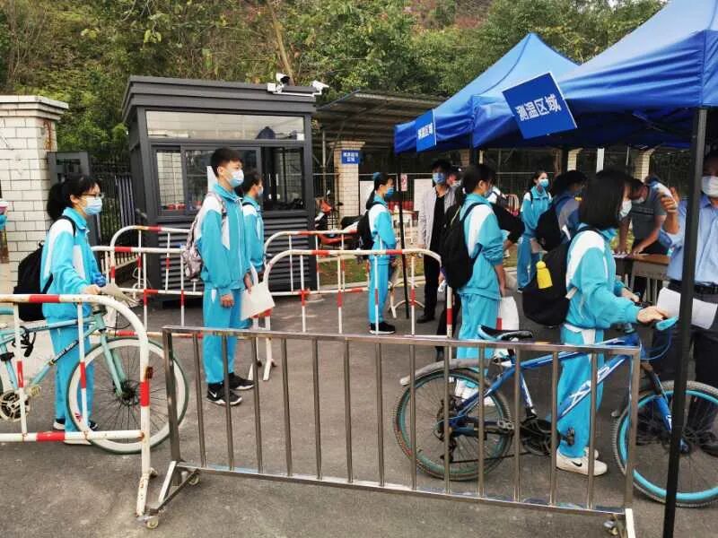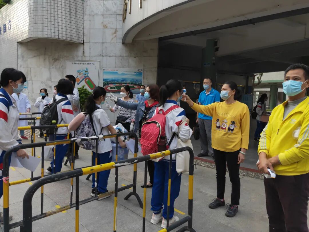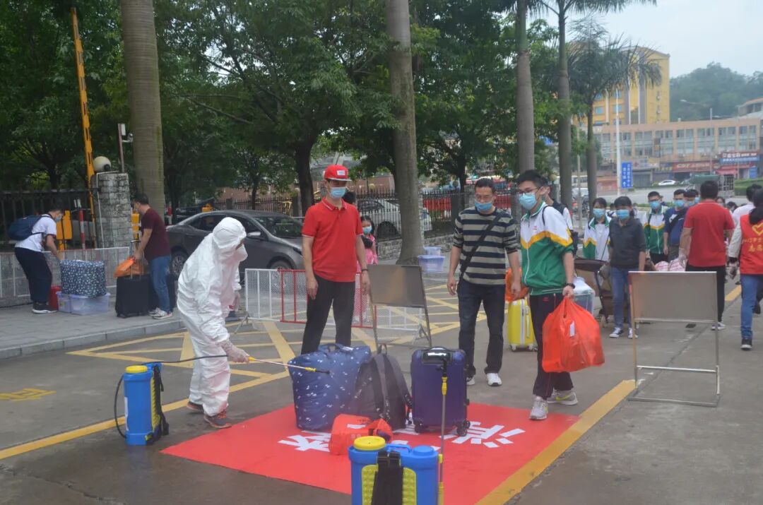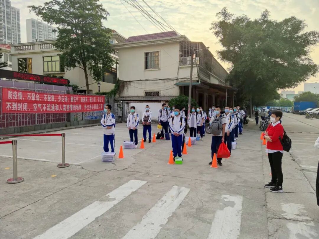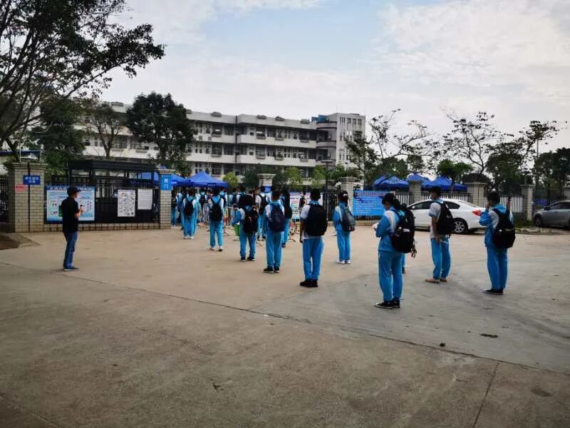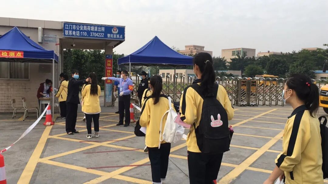 蓬江区各学校严格细致做好学生体温测量、行李消杀等工作,把好入门关。每个环节责任到人,班主任老师在各班门口等待学生,宿管员在宿舍楼维持秩序,学生行走路线固定,全力做好开学教育教学和疫情防控工作,确保学生在校期间“静时有坐标、动时有轨迹”。