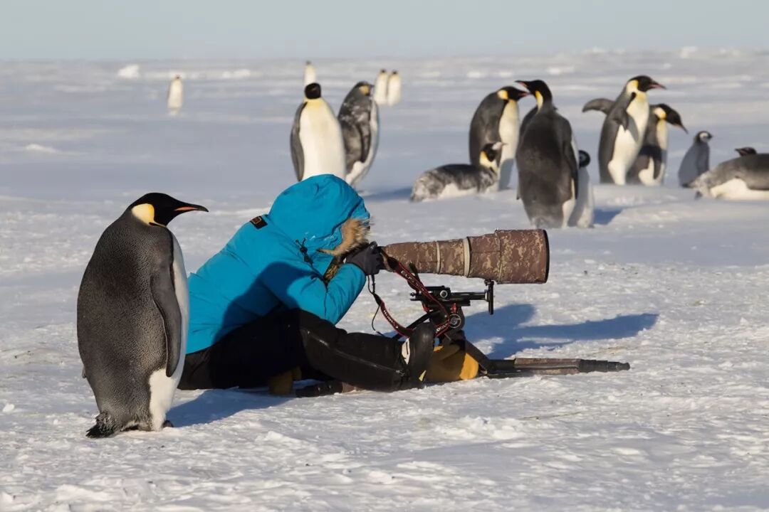 有一张照片特别能反映这种关系。在南极拍摄帝企鹅的时候,一只憨态可掬的企鹅跑到了离顾莹不到半米的地方瞅着她。顾莹觉得它的内心戏应该是“咦,这是什么动物呀”?
