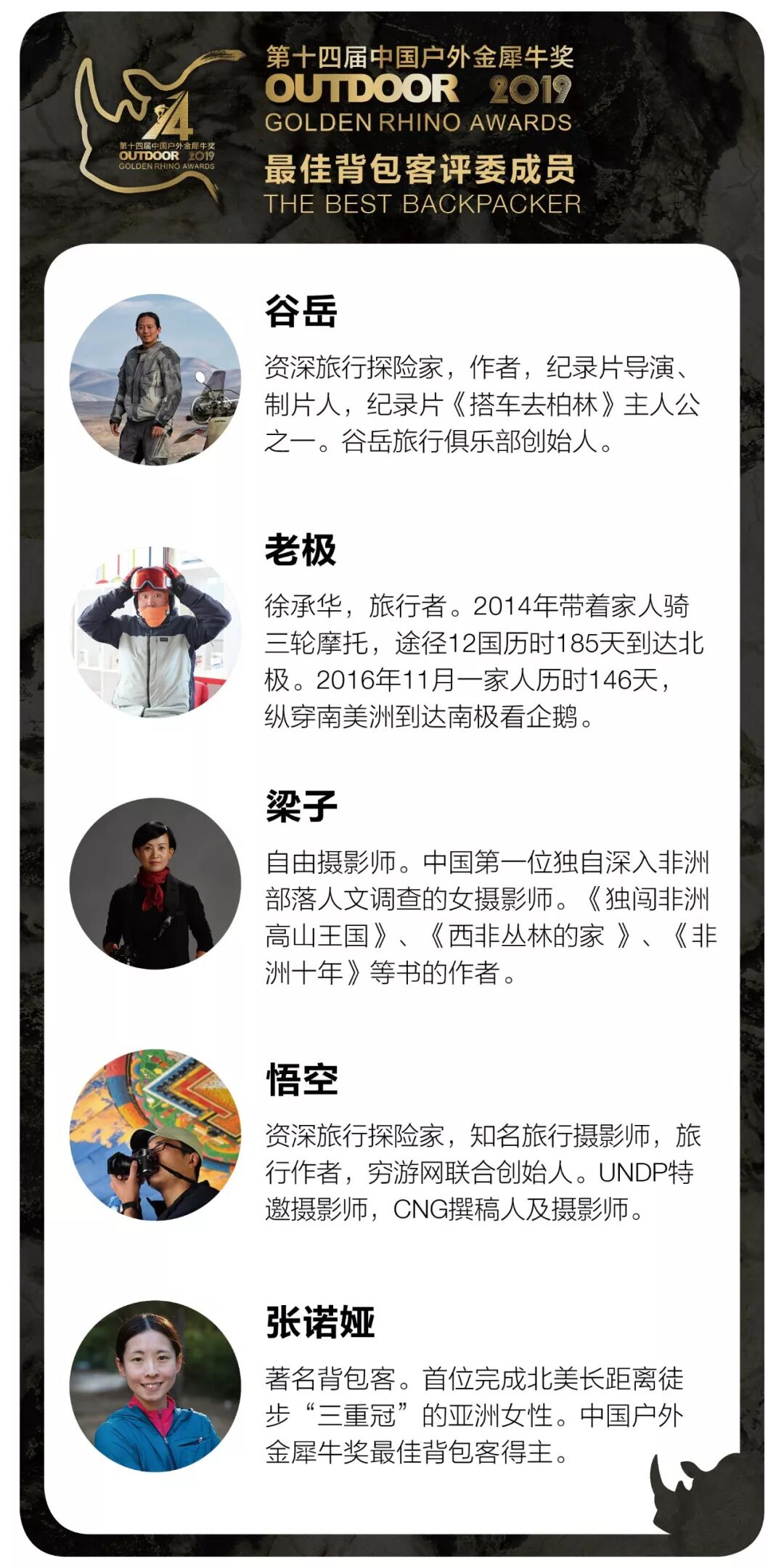 “中国户外金犀牛奖”是《户外探险》杂志于2006年发起的一项年度评选活动,它以“真正的户外探险,记录行进中的户外中国”为主题,回顾过去一年中国户外发展历程,遴选出最高水平、最具推动力和先锋精神的年度户外事件与人物。