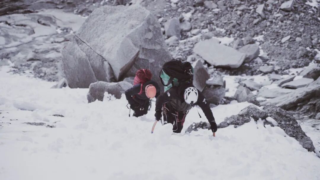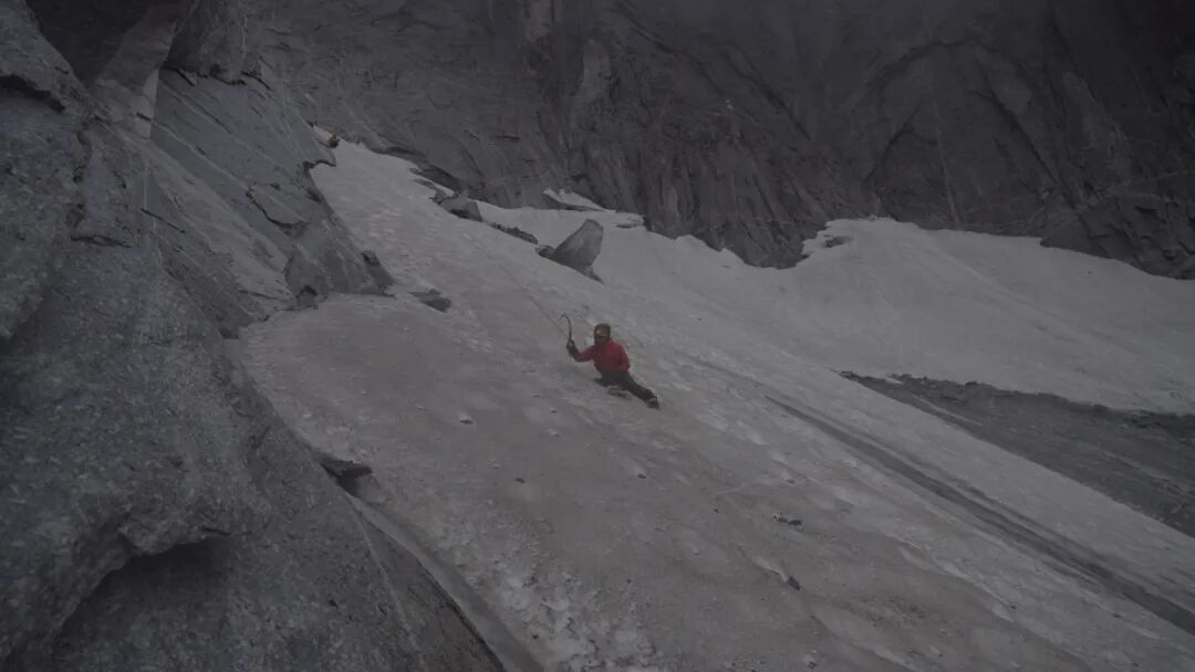 中间要跨过200米冰川,冰川角度从30度逐渐过渡到60度,我们三个人无保护独立行进,Rocker还要兼顾拍摄工作。
