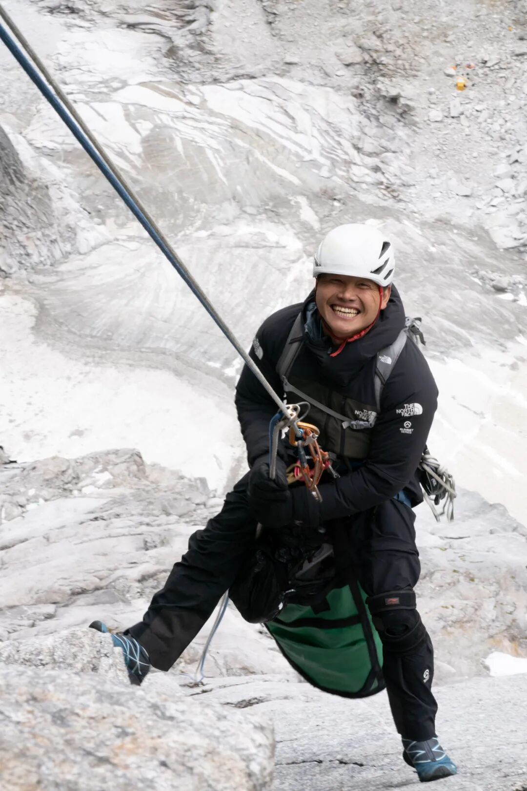 按部就班地操作,下降,清理保护站,重设下降站,连接,等待,抽绳,下降,一段又一段地重复着。下降时,孙斌脸上的笑容和挂在身下的大拖包,是矛盾和谐统一的最佳注释。