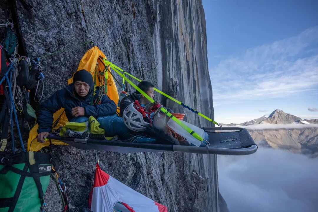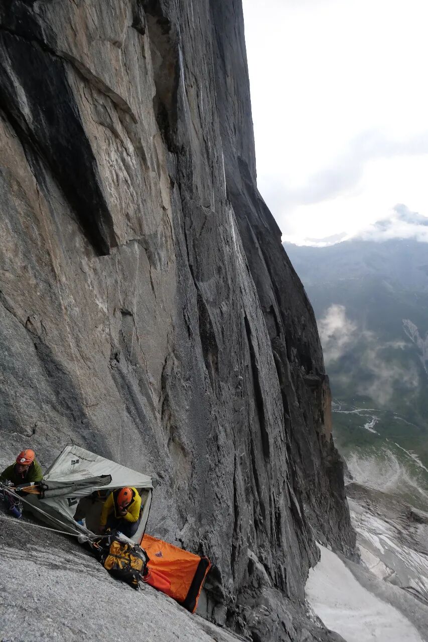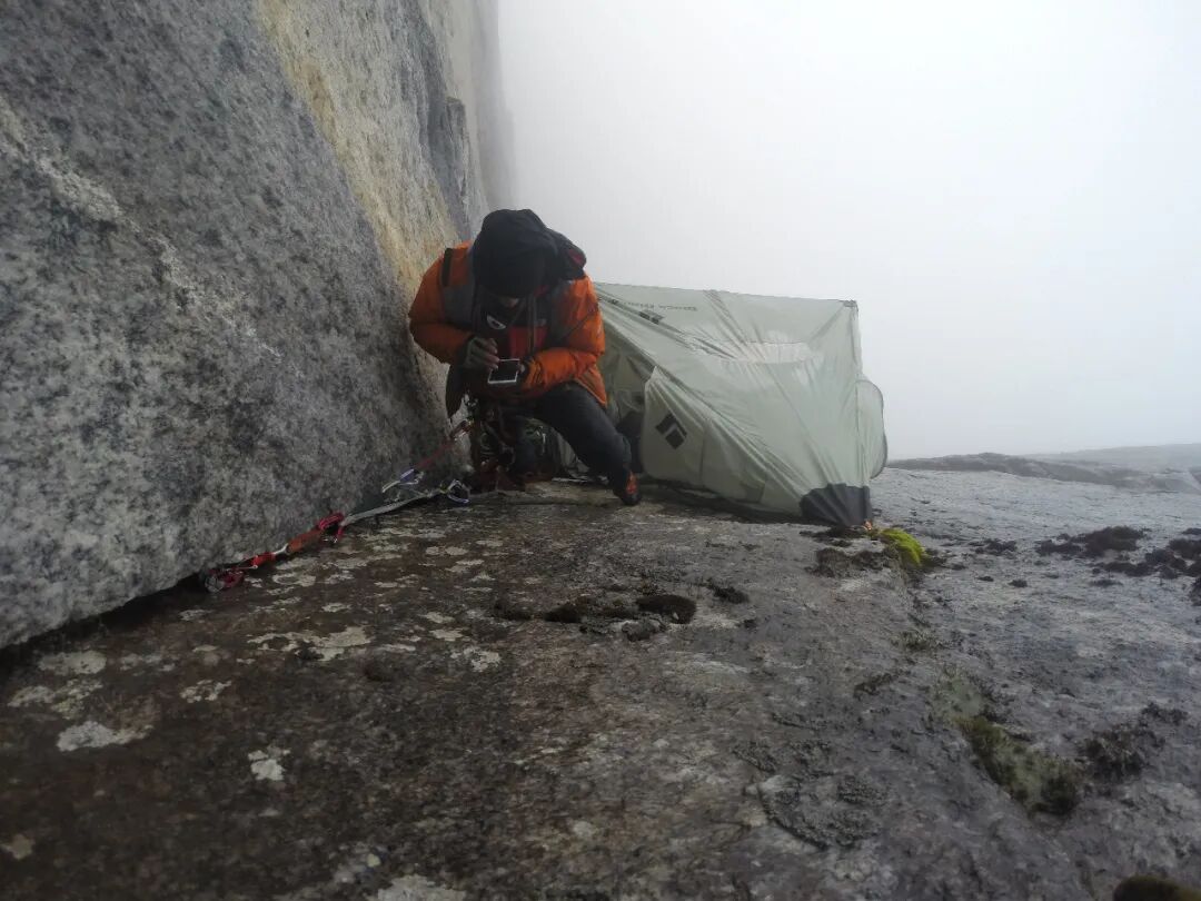 指给孙斌看,不久前还自由落体屁股着地坐下的他不由得呆住。我赶紧拉着他靠近岩壁这边。我们在吊帐里跟专用主绳有备份连接,内帐脱落人不会掉到山下摔死,但会突然下坠一两米吓个半死。