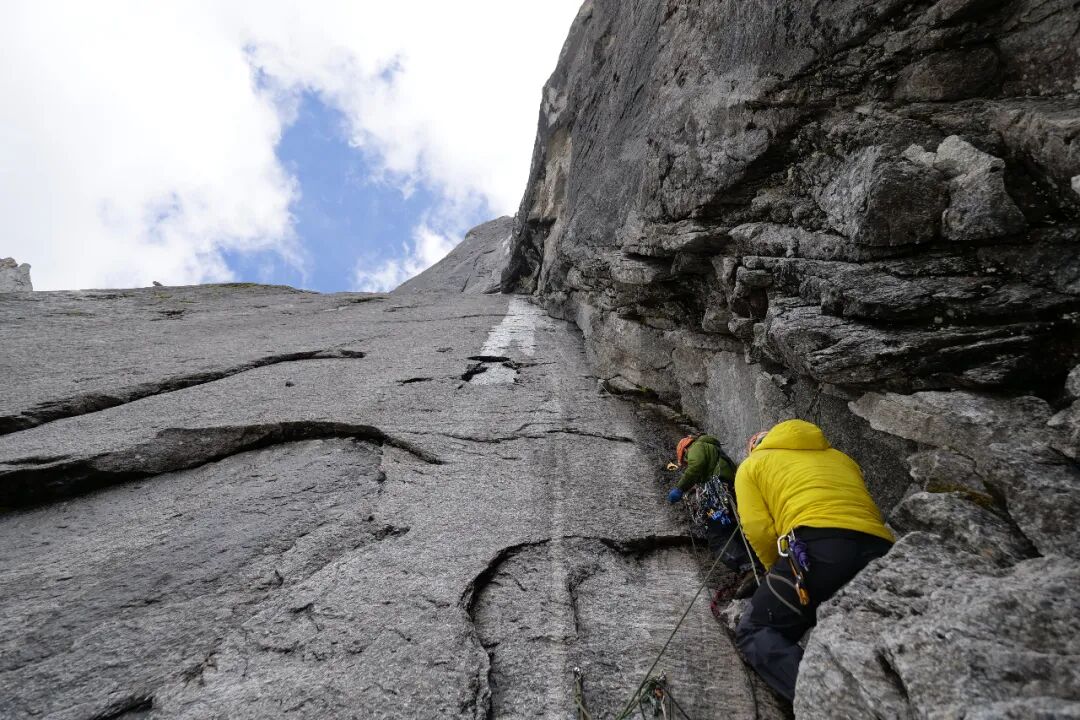 正爬着,几颗白色泡沫飘来,越来越多,是冰雹,还没有来得及多想,小冰粒倒豆子一般倾泻而下。好在这个位置脚点不错,可以站着靠住背后岩壁。这是整个岩壁的低处,上方所有的冰雹汇聚下来,一转眼脚下缝里的机械塞被埋了。