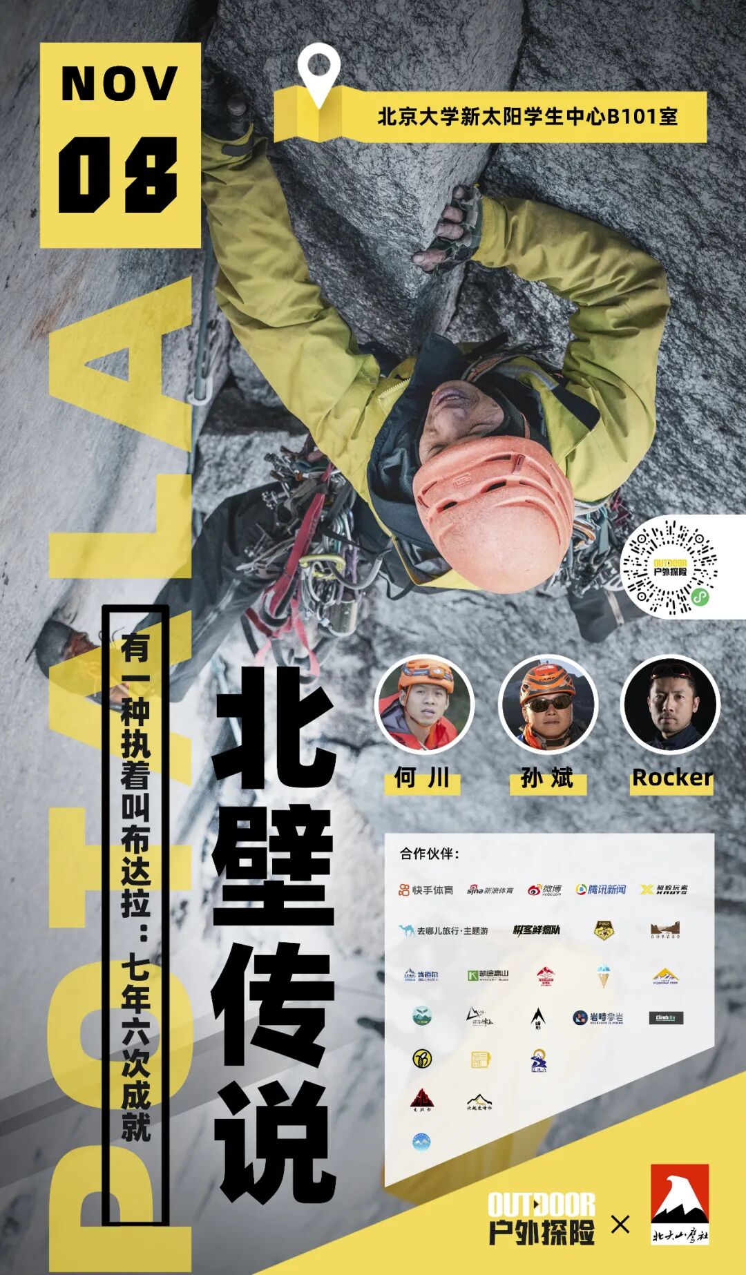 11月8日18:00,户外探险联合北大山鹰社,邀请何川、孙斌、Rocker现身北京大学,与你一同重回布达拉,讲述传奇攀登背后的故事。
