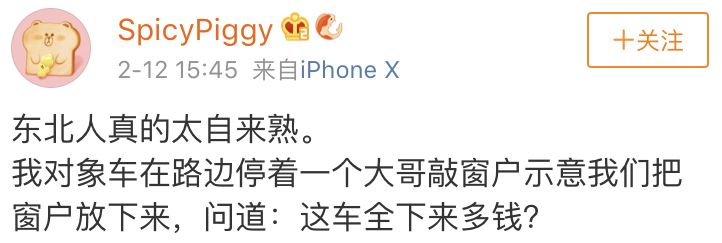 这不,前两天博主@SpicyPiggy就在路边,被东北大哥敲了敲窗户,一点儿不见外地咨询“车全下来多少钱”,然后甩下一句“谢谢啊”(请脑补范伟老师的声音)扬长而去。
