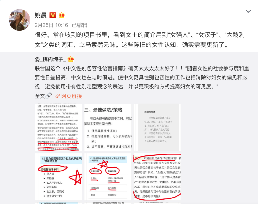前阵子,女演员辛芷蕾发的这条微博,让网友们炸开了锅。“不用香水的女人没有未来”这句话不是辛芷蕾的原创手笔,但她还是因为引用不当而突遭众责,因为网友们认为这句话十分不尊重女性。歧视女性并不是辛芷蕾的本意,但她还是一不小心踩了大雷。由此可见,语言歧视在我们的语言沟通中到底藏的有多隐蔽。上面这3句看似再正常不过的话,其实都包含了性别偏见。为什么?对比一下就知道了。“这是个妇孺皆知的道理”和“这是个众所周知的道理”虽然第一组句子读起来很顺口。但通过对比,我们依旧能感受到,第二组的表达其实更具有性别包容性。有事业心的女生,少不了听到“女强人很难得到家庭幸福”的论调;共同就餐时,女生对男生说“你是男生,多吃一点没关系”等等...这些日常表达其实都包含了性别偏见。但正是因为这些话过于普遍和常见,我们往往难以察觉其中的不妥之处。所以,对于大部分人来说,即使从来都没有有意识地歧视谁,却从没少说这些饱含偏见的话。语言是思想或观念的表达载体,歧视的语言多跟歧视的观念有关。与此同时,我们日常所读到的每一个字、听到的每一句话、看到的每一个画面也都在不动声色地训练着我们的潜意识信息库。我们的日常语言就这样无形地被性别偏见观念所影响着。首先,日常用语中的歧视性表达本就由来已久且十分普遍。最常见的就是,众多表述将女性放在了附属位置。比如在婚姻嫁娶中,女性是“嫁给”,男性是“迎娶”,女性被默认放在“被动客体”的位置。又或者是“父母、夫妇、兄嫂”之类的表达,如果将女性身份放在男性之前,读起来马上就倍感奇怪。此外,很多带女字旁的汉字,常常饱含负面含义:奴,奸,婪,妒,姘,嫉等。而正面的字,比如妍,妙,媚,娇,嫩,妩等,又都是把女性当做外表审美对象来看待的。同时,根据日常表达习惯,大多数人能接受女性男性化,但不太能接受男性女性化,因为男性有女子气后,就显得“从高等级的性别变成了低等级”。因此,才会形容男性化的女性为“女强人”或者“Man”,但却形容女性化的男性为“娘炮”、“娘娘腔”、“不是男人”。除了语言本身所包含的歧视,人们运用语言的方式有时也包含着性别偏见。在媒体报道中,从来不会看到“美国男总统奥巴马”、“打人男司机被指脾气暴躁”之类的表述,但“韩国女总统”、“女司机抱狗开车”这种表达却成为吸引人眼球的手段。人们已经习惯于把一些称谓、职务、行为等划归为男性独有,而女性一旦涉足,则必有女性标记,这甚至成为了一种猎奇方式。除了“女司机”、 “女科学家”之类的标记词,有些问题也是为女性量身定做的,比如最常见的“怎么平衡事业和家庭?”。上到事业有成的知名人士,下到平凡如你我的打工族,只要你是性别女,不管在采访中还是面试中,这个问题从未缺席。正如神经系统科学家Janet Crawford在TED演讲中所说,“我们所有人,男性与女性,都有无意识的性别偏见,这些偏见引导着本意善良的男人和女人们无意识地延续加深性别偏见的现状”。TED视频:从心理学上看性别不平等——无意识偏见