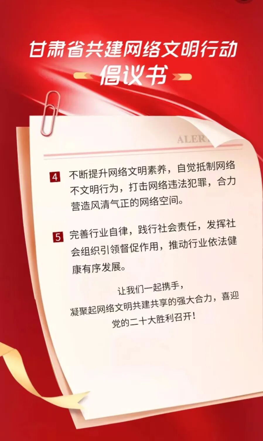 据悉,2022年甘肃省网络文明宣传月包括网络安全宣传周、网民素养提升周、网络文明成果宣介周、“喜迎党的二十大·网络名人陇原行”活动周,十四个市州将同步开展各项宣传活动。