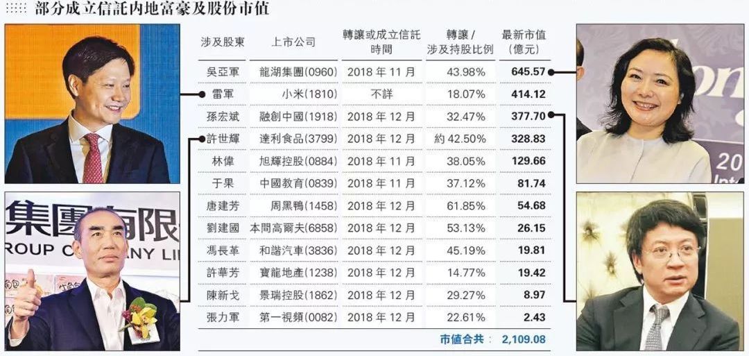 媒体的公开资料显示,2009年到2018年,马云、刘强东、孙宏斌、雷军、吴亚军等在中国富豪榜排名前10到后几百的一大半富豪都各自创立了离岸信托。