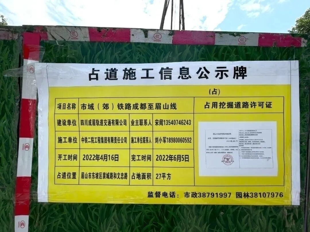 早在今年初,眉山《政府工作报告》提出:开工建设市域铁路S5线是眉山今年全力抓好的十件大事之一。为推动S5线的建设,眉山成立了以书记、市长为组长的眉山市域铁路S5线建设推进工作领导小组,建立定期调度机制,倒排工期、挂图作战,并与省同城化办紧密对接,形成工作合力。细心的你不知道有没有发现,眉山城区一些地方已经出现了“占道施工信息公示牌”。
