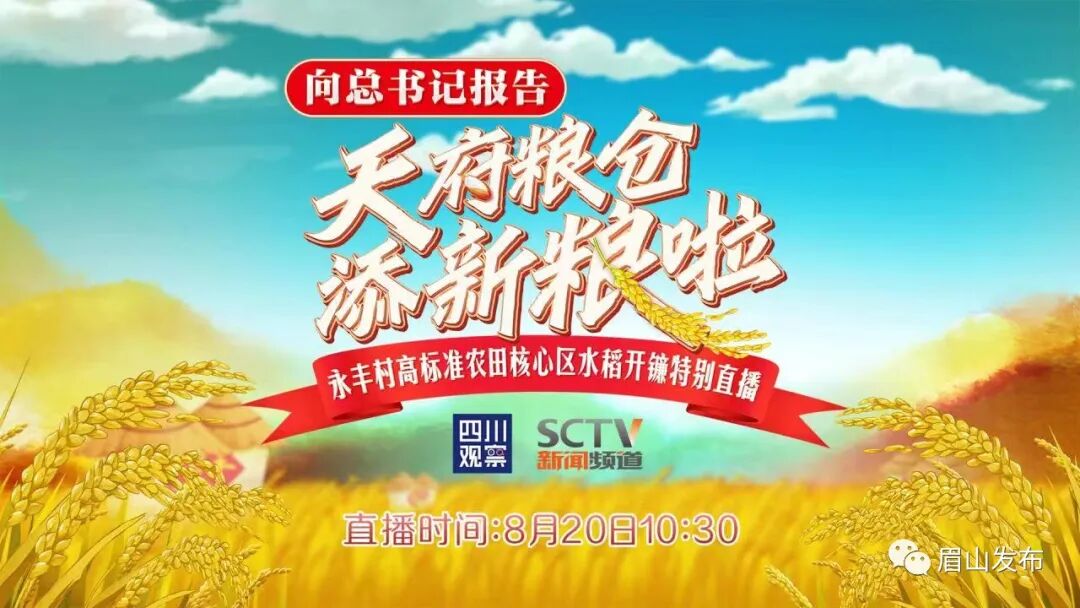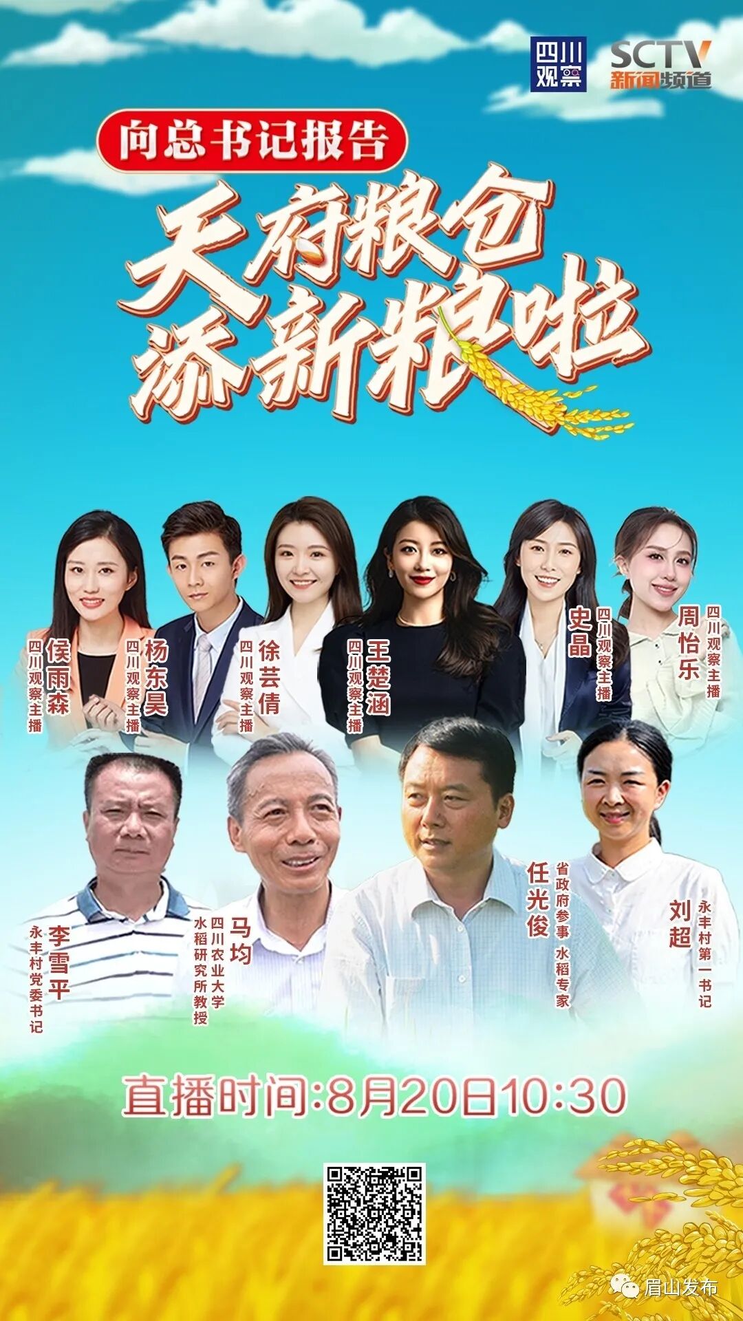 永丰村稻谷亩产能否再创新高,水稻专家如何解开种子的“密码”,天府粮仓今年又迎来怎样的“丰景”?8月20日上午10:30,四川广播电视台四川观察、四川新闻频道重磅推出永丰村高标准农田核心区水稻开镰特别直播《向总书记报告:天府粮仓添新粮啦!》