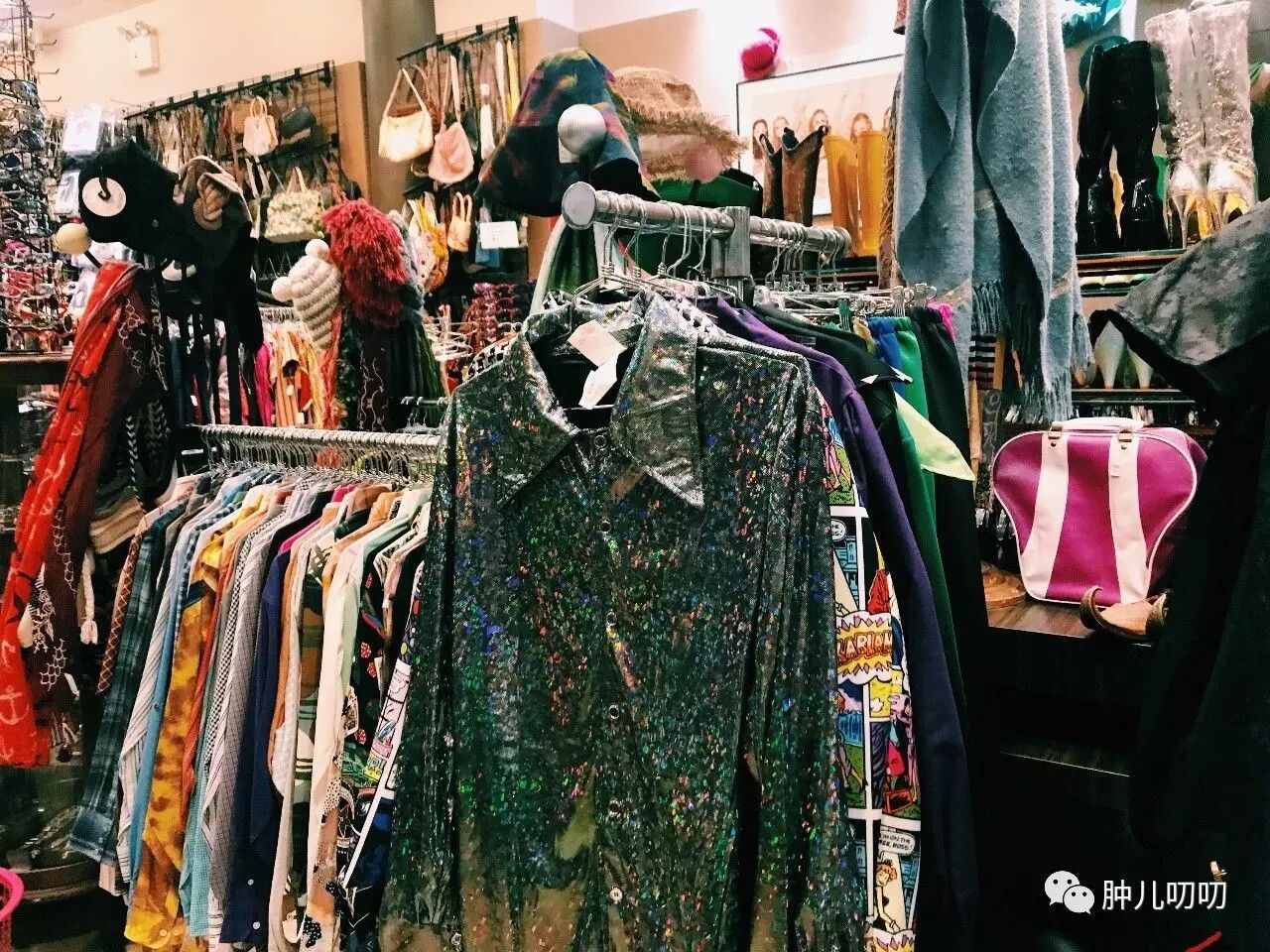 这家店我犹豫了一会究竟要不要推荐,因为对它的定位我真的很迷,错乱得我无法概括。门面看起来很小,而且外面还被施工铁架挡住,一进门居然是卖明信片和小孩玩具的,刚进门我就想掉头走,但是走多几步,发现门面虽小,但是里面还蛮大的,古着的衣物都在店的里部。为什么说对这家店铺的风格很迷呢?因为你会发现什么风格的衣服都有,有维多利亚时期的蕾丝长裙,DISCO亮瞎眼T恤,老男人夏威夷衬衫,古着婚纱,中世纪舞会礼服,军用服饰......所有东西搭配在一起很天马行空,不得不说真的什么都有,halloween来这里淘衣服准没错了。最后,这里的包包值得推荐,就是需要耐心寻找。