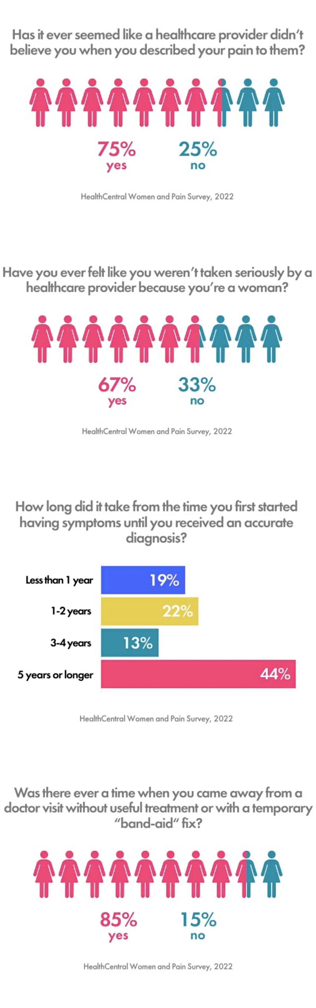 2022年发表在healthcentral上的一篇文章,汇总了关于女性患有慢性疼痛疾病以及就诊的相关调查研究。