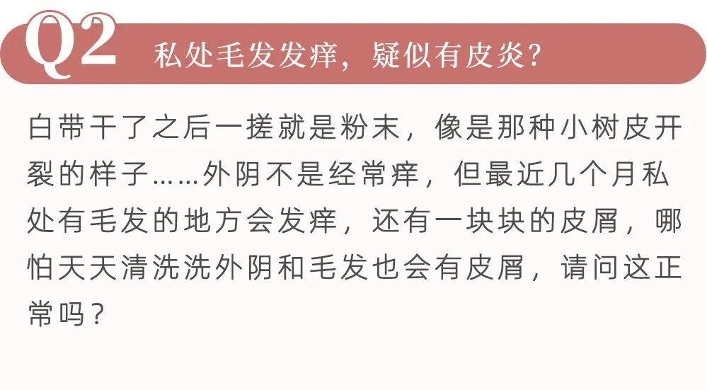 出现皮屑的情况,大多数是局部过于干燥或者由于过度清洁造成皮肤屏障不完整。所以请检查一下平时洗护是否过度,有没有使用某些「妇科洗液」或大力摩擦局部。