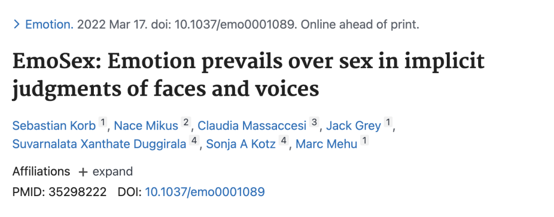发表在《Emotion》杂志的一项研究表明,面部和声音在生气时更有可能被判断为男性,而在快乐时更可能被判断为女性。也就是说,我们如何理解面部或声音的情感表达在很大程度上受到感知性别的影响,反之亦然。