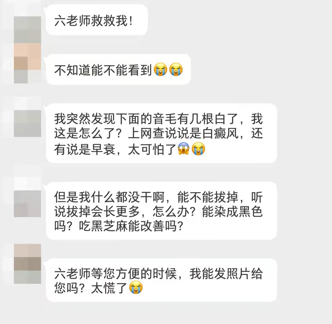 大致意思就是说:姑娘无意间发现下面的阴毛有几根变白了,非常慌张,担心可能是有什么疾病,或者有啥潜在的隐患,然后就想着改善这种情况,想问问能不能染发,或者吃黑芝麻什么的……