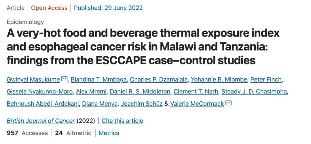 来自国际癌症研究机构 (IARC)、马拉维医学院、乞力马扎罗山临床研究所和莫伊大学的研究人员不久前在Nature子刊《BJC》上发表了这项题为《A very-hot food and beverage thermal exposure index and esophageal cancer risk in Malawi and Tanzania: findings from the ESCCAPE case–control studies》的新研究。