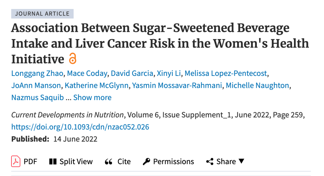 前不久,来自南卡罗来纳大学、哈佛大学等研究机构的科学家在2022年美国营养学会年会上发表了这篇题为《Association Between Sugar-Sweetened Beverage Intake and Liver Cancer Risk in the Women’s Health Initiative》的研究。