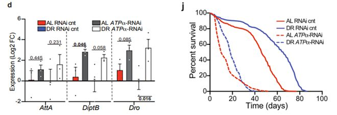 首先,研究人员利用RNA干扰技术使果蝇眼部ATPα基因表达下降,制造出了视力退化的果蝇,结果发现这些视力退化的果蝇全身炎症水平提高,并且寿命明显缩短。