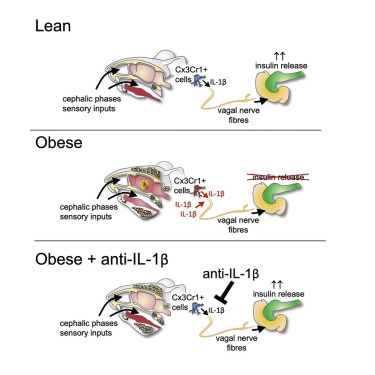 随后,科学家深入研究了「头期胰岛素释放」的机制,发现给小鼠喂食后,小鼠脑内小胶质细胞释放炎症因子IL-1β,促进了胰岛素的释放。