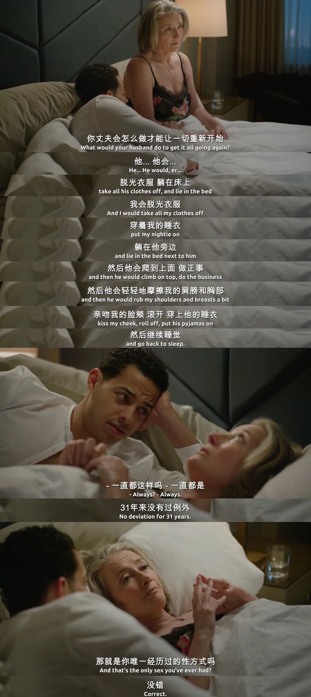 除了「买春」的负罪感,和年轻肉体在一起的违和,还有对自己深深的怀疑。南希无法直面自己的欲望,也厌恶自己衰老的身体。褶皱的脸、松垮的皮肤、下垂的肚子,她害怕自己不够性感,担心里奥对她产生嫌恶,好几次想结束这场荒唐的性事。