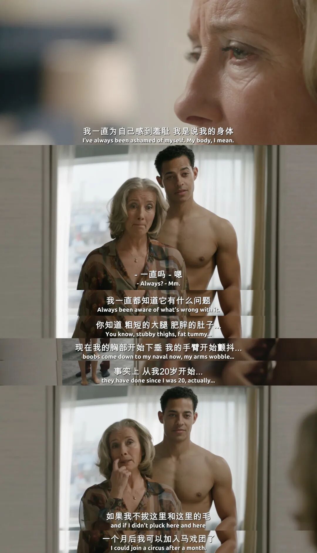 南希的蜕变,从胆怯到自信,不仅仅是性带给她的,更多的是自我接纳的力量。最后当她站在镜子前脱掉衣服,仔细端详自己的身体,接受岁月带来的痕迹,她不再焦虑担忧,而是平静。