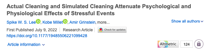 其实,这种心理是有科学依据的。2022年发表在《Social Psychological and Personality Science》上的一项研究发现,无论是视觉模拟的清洁行为,还是真实清洁行为,都有解压的效果,有助于降低压力对人身体和心理的伤害。