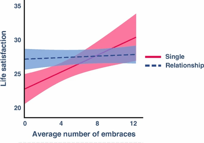 并且处于单身状态的人,从拥抱中获得的好处更大,恋爱中的人拥抱频率与生活满意度没有明显联系,而单身人士拥抱频率越高,生活满意度越高。