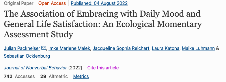结果发现,拥抱频率更高的人,情绪更加积极,孤独感更低,神经质评分更低。