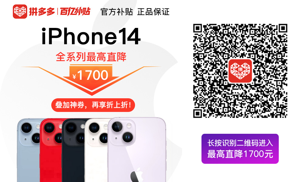 前阵子发布的iPhone14系列还热乎着,拼多多百亿补贴就已经覆盖上了,iPhone14全系列最高直降1700元!叠券再享折上折!