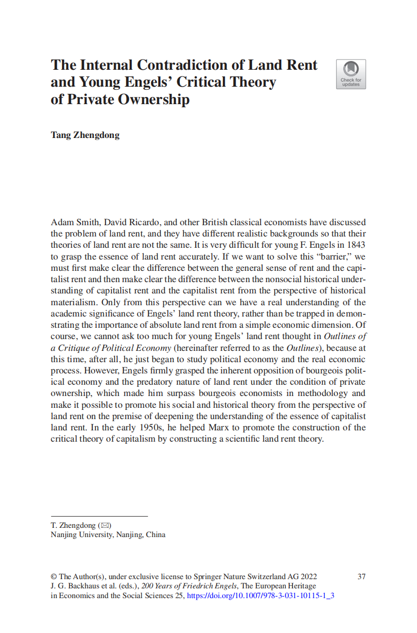 近日,由德国斯普林格(Springer)出版社编辑出版的国际集刊《弗里德里希·恩格斯诞辰200周年:对其生平与学术的评判》(200 Years of Friedrich Engels: A Critical Assessment of His Life and Scholarship)问世。该集刊收录了南京大学马克思主义社会理论研究中心两位研究员的两篇研究性论文,分别为唐正东教授的《地租的内在矛盾性与青年恩格斯的私有制批判理论》、康加恩(Kaan Kangal)副教授的《论恩格斯的“辩证法”、“自然”和“自然辩证法”概念》。该集刊共收录来自世界各地学者共11篇学术性论文,这是中国学术界唯二入选该集刊的文章。