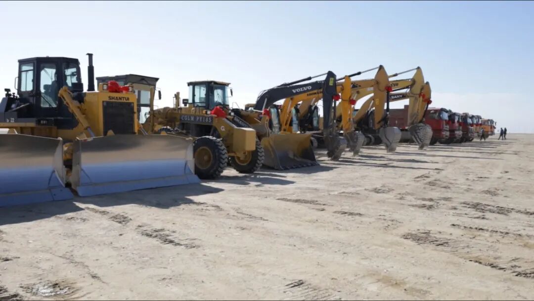 图为奠基现场的大型机械开始平整施工现场地面。