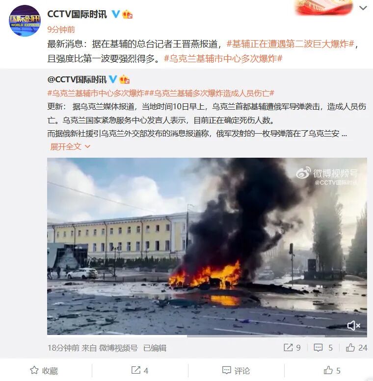 乌克兰炸了俄罗斯的克里米亚大桥之后,今天迎来俄罗斯的反击。据CCTV国际时讯,当地时间10日早上8点30分(北京时间今天下午1点30分),乌克兰首都基辅市市长克里琴科在官方社交账户上发布消息称,乌克兰基辅市中心多次爆炸。此外还有目击者称,基辅的几栋建筑冒起了滚滚浓烟。克里琴科表示,各部门均已就位,具体细节将在稍后补充。 法新社10日刚刚消息称,据该媒体记者消息,乌克兰首都基辅传出三声爆炸巨响。
