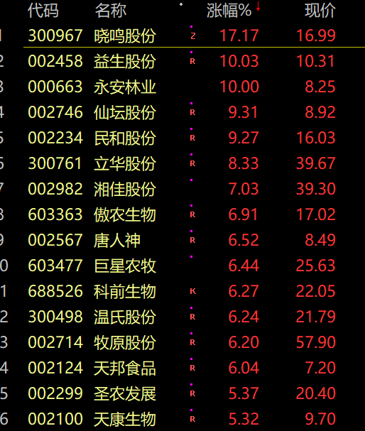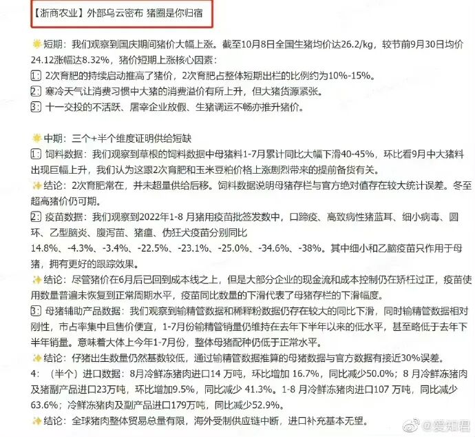 汽车整车板块走低,赛力斯跌停,长城汽车、安凯客车、江铃汽车、亚星客车等跟跌。 猪肉、鸡肉狂掀涨停潮,消息面上,欧洲暴发史上最大规模禽流感,欧洲食品安全局、欧洲疾病预防控制中心和欧盟参考实验室联合报告的最新数据显示,家禽共暴发2467次疫情,受影响场所扑杀了4800万只禽鸟,圈养鸟类检测到187次,野生鸟类检测出3573次高致病性禽流感事件。此外,猪肉价格国庆期间也实现“七连涨”,中国养猪网显示,截至10月9日,生猪价格报26.57元/公斤,较节前上涨8.27%,同比增幅达140.45%,为2021年5月以来的新高。![]()