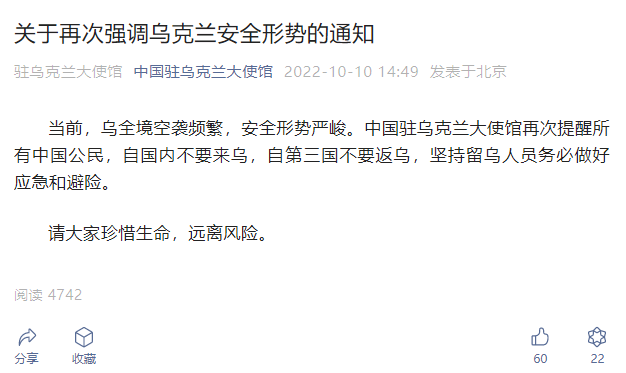 乌克兰基辅州、赫梅利尼茨基州等地的防空系统已启动,拦截来袭的俄方导弹。乌克兰媒体报道称,位于乌克兰西部的捷尔诺波尔州以及东部城市哈尔科夫遭到俄军攻击。位于乌克兰北部的日托米尔州遭到俄罗斯武装力量攻击。据央视在基辅的记者报道,基辅正在遭遇第二波巨大爆炸,且强度比第一波要强烈得多。俄媒称,俄军发射的一枚导弹落在了乌克兰总统办公室附近。此外,乌总统办公室称乌多座城市遭俄军导弹袭击,已造成平民伤亡。10日,中国驻乌克兰大使馆通过官方微信公众号发布提醒:当前,乌全境空袭频繁,安全形势严峻。再次提醒所有中国公民,自国内不要来乌,自第三国不要返乌,坚持留乌人员务必做好应急和避险。