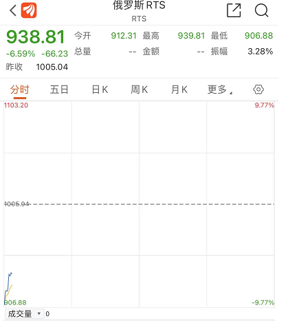 俄罗斯股市大幅低开,俄罗斯RTS指数跌超9%,俄罗斯MOEX指数跌超8%。