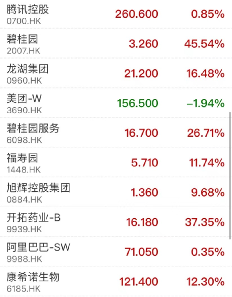 盘面上,内房股与物管股携手爆发,碧桂园史诗级上涨,收盘涨超45%领涨蓝筹,碧桂园服务涨近27%,德信中国涨超110%,龙湖集团涨超16%;医药类股持续活跃,开拓药业涨超37%,腾盛博药涨超34%;工业、公用事业板块走强,阿里健康涨近16%。
