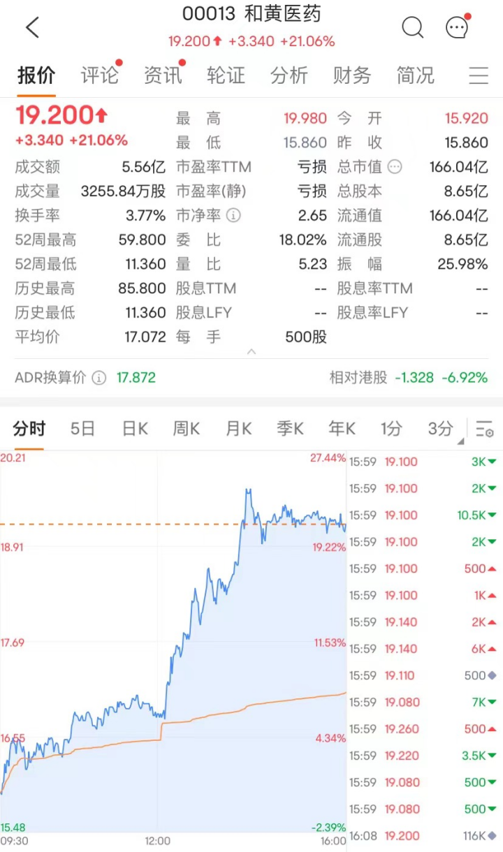 医药股板块强势的今日,再叠加一则利好,脱胎于李嘉诚旗下和记黄埔的和黄医药今日股价大幅走强,盘中一度涨超23%,截至收盘,和黄医药收涨21.06%,报19.2港元/股,最新总市值166.04亿港元。