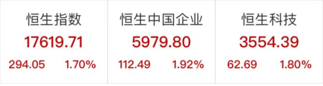 11月14日,港股盘初大幅高开,恒生科技指数一度涨超4%,午后三大指数略有回落,最终仍全线收涨,延续上周反弹行情。截至收盘,恒指收涨1.7%,涨近300点;恒生科技指数涨1.8%,报3554.39点;恒生国企指数涨1.92%。报5979.8点。