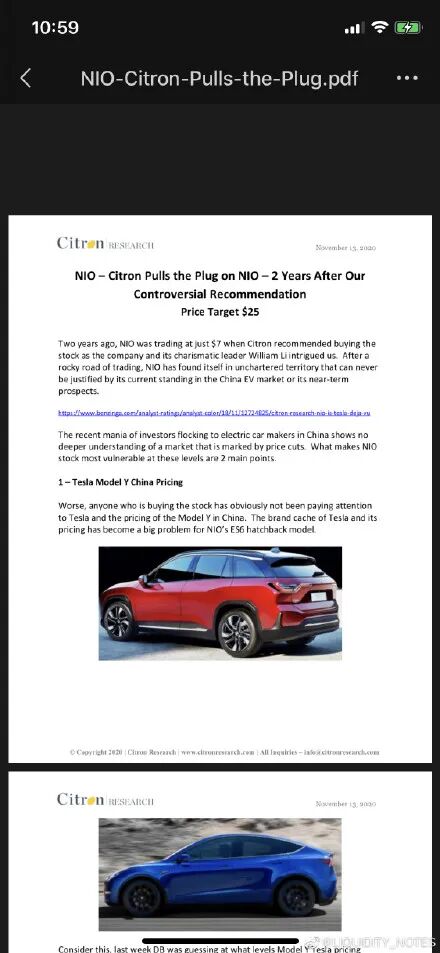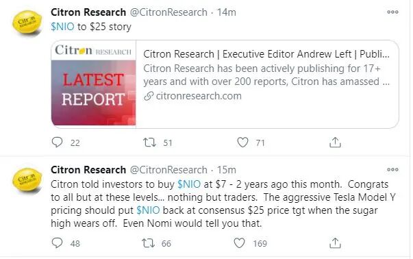 昨夜美股盘中,做空机构香橼资本发表推文,称蔚来汽车目标价应为25美元。
