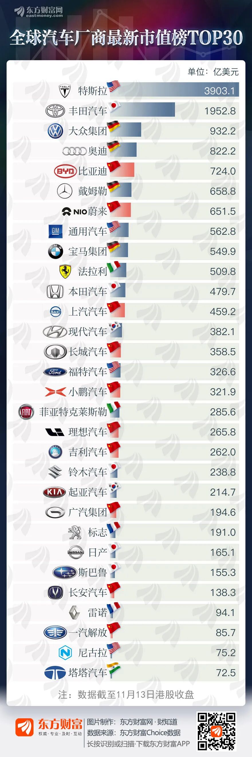 据东方财富网统计,在全球市值排名前30的知名汽车厂商中,中国企业有10家,有2家企业冲进前10。截至11月13日,比亚迪市值约724亿美元,超越戴姆勒的659亿;蔚来市值652亿美元,超越通用和宝马;长城汽车市值359亿美元超越福特;小鹏汽车市值超300亿美元,理想、吉利等车企市值也均超200亿美元。