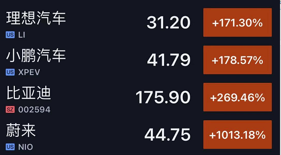 不过,今年以来,蔚来的涨幅仍是10倍,小鹏、理想的涨幅均接近200%!